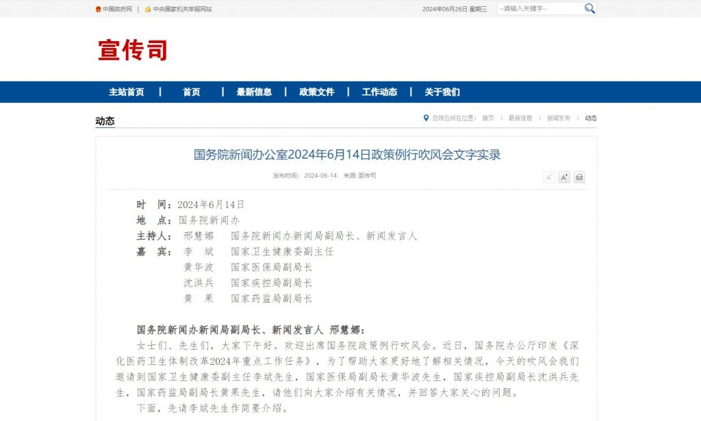 日前,國務院辦公廳印發(fā)《深化醫(yī)藥衛(wèi)生體制改革2024年重點工作任務》,為了幫助大家更好地了解相關情況,國務院新聞辦公室在6月14日舉行了國務院政策例行吹風會。