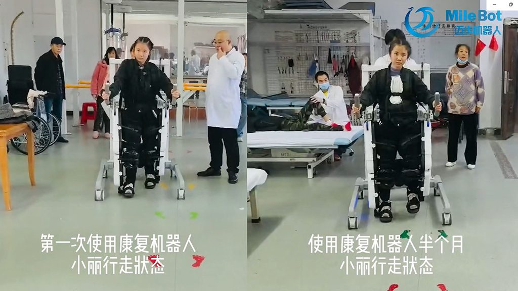 (使用康復機器人一周后,攙扶拐杖下,小麗可以慢慢地穩(wěn)步走動)